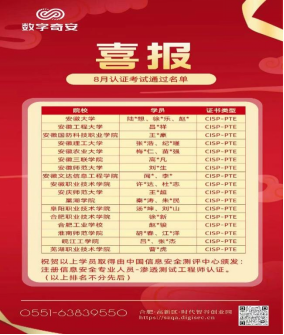 近日,中国信息安全测评中心举办了CISP-PTE认证考试,我校2023届网络信息安全专业毕业生赵世骏同学在校企合作单位合肥数字奇安网络信息科技有限公司参加了考前培训,最终以99分第一名的成绩顺利通过考核。
