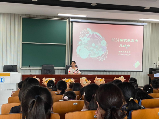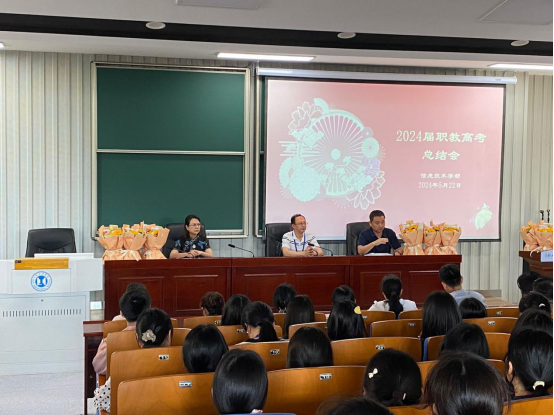 会议开始,聊宗龙主任对本届职教高考情况进行汇报分析,对所有职教高考同仁们表示感谢并对22级和23级的老师和学生提出了要求,他宣读了本届职教高考表彰名单,校领导为他们献上鲜花。
