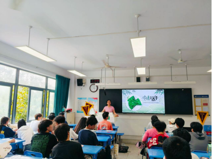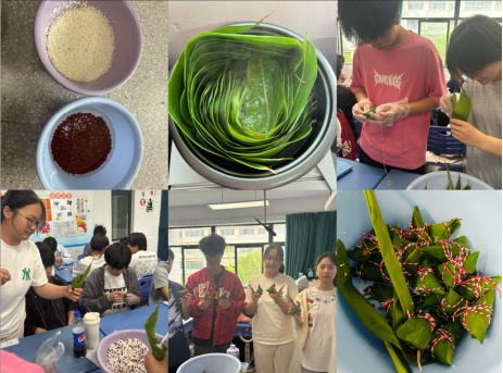 活动伊始,包粽子环节率先登场。在老师和心灵手巧的同学示范下,大家纷纷拿起粽叶,学做传统美食。卷粽叶成漏斗状、填入糯米红枣、压实封口、捆扎定型,看似简单的步骤,实际操作起来却需要不少技巧。尽管起初手忙脚乱,折坏粽叶、漏出米粒的状况频出,但在相互帮助与耐心练习下,一只只形态各异的粽子逐渐成型。教室里粽叶清香与欢声笑语交织,满是节日的温馨氛围。