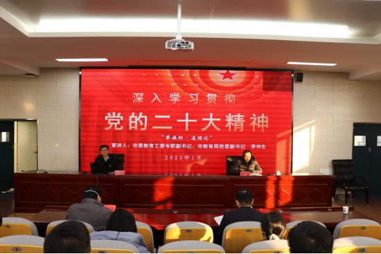 2023年1月6日下午,市委教育工委专职副书记、市教育局党委副书记李仲生在合肥工业学校开展党的二十大精神专题宣讲。学校全体中层及以上干部、各党支部支委参会,校党委书记校长孙健主持宣讲会。在宣讲报告会上,李仲生从党的二十大主题和主要成果、过去五年的工作和新时代十年的伟大变革,紧密结合安徽合肥实际重点从深刻领会新时代伟大变革的根本原因、中国式现代化、全面建设社会主义现代化国家的目标任务、坚持党的全面领导...