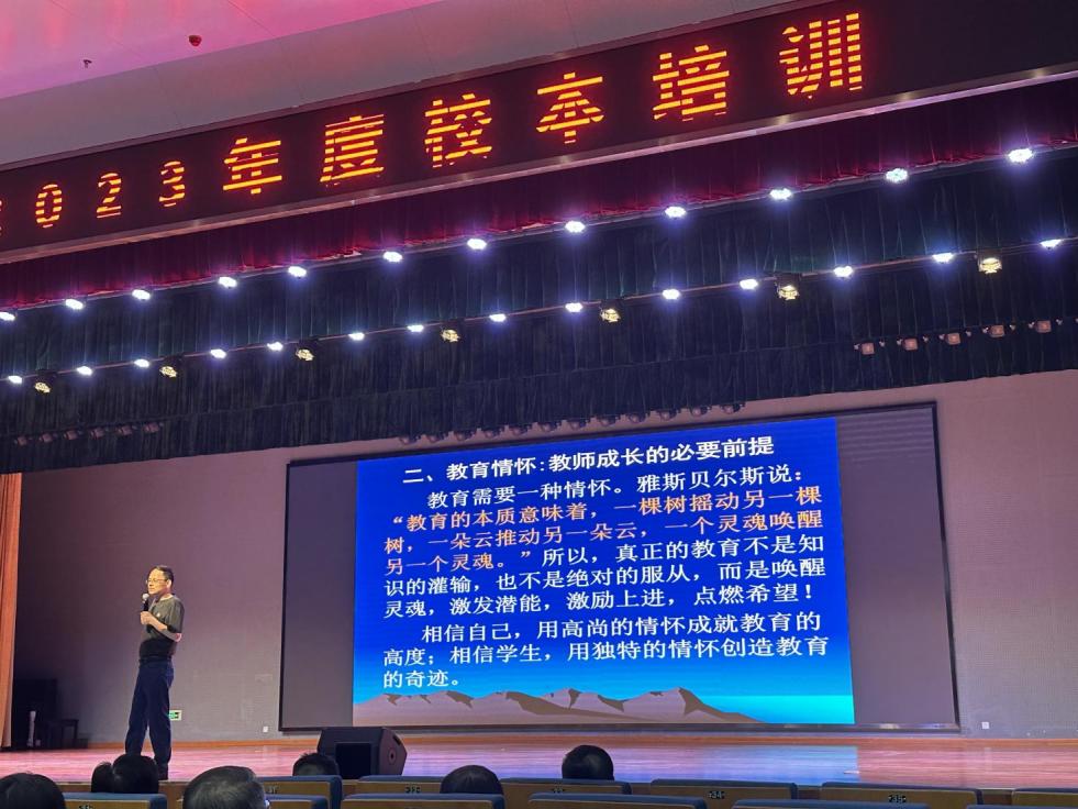 2023年校本培训首场报告于6月30日上午举行,由安徽师范大学教育科学学院教授、博导孙德玉教授开讲,主题是《新时代教师的师德修养与教育情怀》。孙教授首先指出教师职业是最神圣、最幸福的职业,他通过自身教学生涯和人生感悟引导在座教师思考为什么教师是太阳底下最光辉的职业?为什么是最幸福的职业?总结出师德是教师必须承受之重。雅思贝尔斯说:“教育的本质意味着,一棵树摇动另一棵树,一朵云推动另一朵云,一个灵魂唤醒...