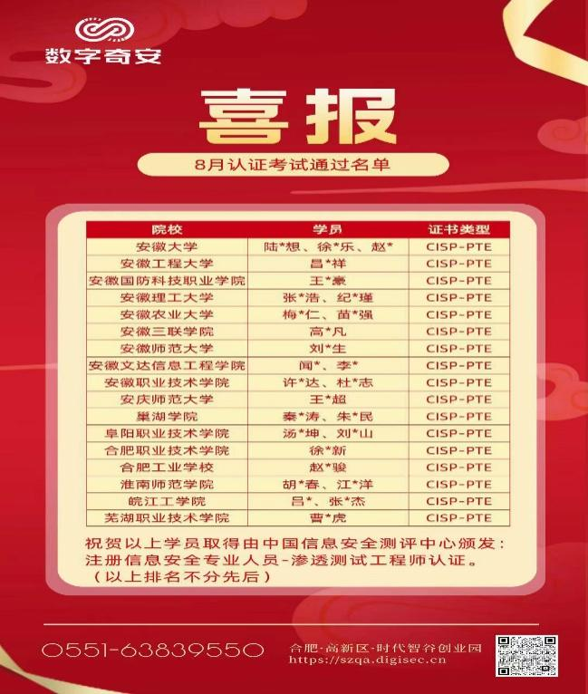 近日,中国信息安全测评中心举办了CISP-PTE认证考试,我校2023届网络信息安全专业毕业生赵世骏同学在校企合作单位合肥数字奇安网络信息科技有限公司参加了考前培训,最终以99分第一名的成绩顺利通过考核。CISP-PTE中文全称国家注册信息安全渗透测试专家认证。证书持有人员主要从事漏洞研究、代码分析工作,具备对多种攻击方式的技术方法较全面掌握、对最新网络安全动态跟踪研究以及策划解决方案能力。我校与数字奇安公司在2021...