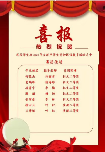 近日,合肥市教育局公布了2023年合肥市学生资助诚信教育活动月演讲及征文评选结果,合肥工业学校学生再获佳绩,共有7个作品获奖。为深入学习贯彻党的二十大精神,进一步强化学生资助育人效果,广泛宣传资助育人成效,增强学生诚信、感恩和责任意识,构建诚实守信的校园文化。合肥市教育局在2023年5月份开展“学生资助诚信教育主题月”活动。我校结合活动主题开展了丰富多彩、形式多样的活动。其中工商学部开展了“诚信 守信 报...