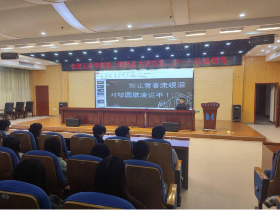 为深入开展学生法治教育,提高学生的法律意识和安全意识,营造文明、平安、和谐的校园育人环境。3月20日下午,我校特邀高教基地派出所民警赵礼贵警官来校在图书馆四楼开展第二期德育大讲堂第二讲法治教育讲座。安全保卫处、学生处和各学部学生代表参加讲座。赵警官根据学校学生的年龄特点,结合近期高教基地典型案例,详细地向学生们讲解了校园欺凌、电信诈骗和帮信罪等知识。讲座通俗易懂,感染力强,学生们听得非常认真,充分...