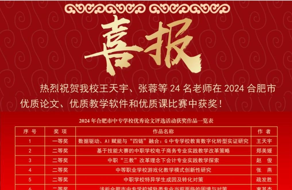 在刚刚揭晓的2024年合肥市中专学校优秀论文优秀教学软件和优质课评选中,王天宇、张蓉等24位老师凭借出色的作品呈现和教学表现获奖,充分展现了我校的教育实力和教学水平。在优秀论文评选中,共有9位老师获奖。其中王天宇老师的论文以其独到的见解和深入的研究,荣获了一等奖。该论文不仅探讨了中专教育在AI应用领域的创新路径,还提出了具有针对性的教学策略,为中专教育的改革与发展提供了有益的参考,充分展示了我校教师在学...