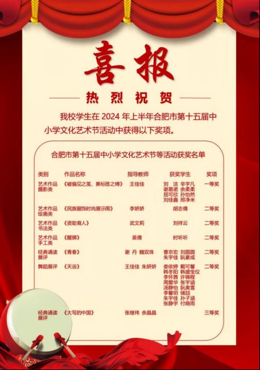 9月18日,合肥市教育局发布《关于公布 2024 年上半年合肥市第十五届中小学文化艺术节等活动获奖名单的通知》(合教〔2024〕191号),工业学子在多项活动中取得优异成绩,其中一等奖1个,二等奖6项,三等奖1项。我校坚持贯彻落实党的二十届三中全会精神、党的二十大精神,加强爱国主义教育,弘扬中华美育精神,并结合我校发展实际,全面落实“德智体美劳”五大行动。进一步丰富校园文化生活,为师生提供展示才华的舞台,彰显各学...