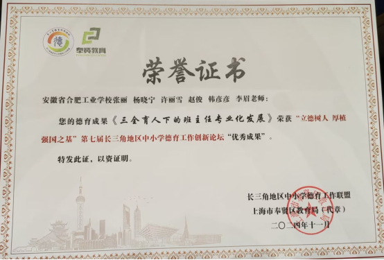 2024年11月13-15日,在上海市奉贤区举办了第七届长三角地区中小学德育创新论坛。合肥工业学校张丽班主任工作室的德育成果《三全育人下的班主任专业发展》荣获“立德树人 厚植强国之基”第七届长三角地区中小学德育工作创新论坛“优秀成果”奖。为深入贯彻落实党的二十大,二十届一中、二中、三中全会和全国教育大会精神,紧扣培养担当民族复兴大任的时代新人,完善立德树人机制,为加快推进教育现代化、建设教育强国、办好人民...
