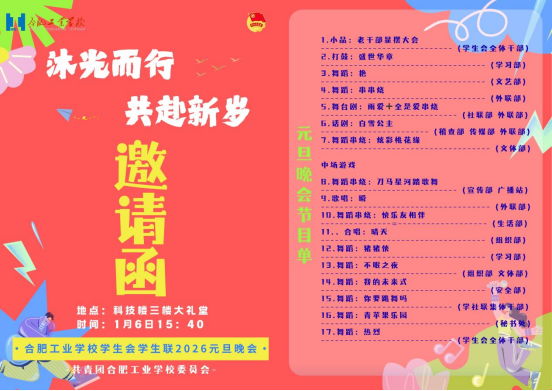 为深入贯彻立德树人根本任务,丰富校园文化育人载体,凝聚青春奋进力量。2026年1月6日晚,合肥工业学校校学生会暨学社联“沐光而行,共赴新岁”迎新晚会在科技楼三楼礼堂隆重举行。校团委朱妍妍、王佳佳老师,各学部学生会主席团及团总支同学与校学生会、学社联全体成员欢聚一堂。在辞旧迎新的温馨氛围中,共赴一场兼具思想性、艺术性与青春活力的文化盛宴,让价值引领在文艺熏陶中落地生根。节目异彩纷呈,青春活力绽放本次晚...