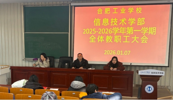 2026年1月7日下午,信息技术学部在学部二楼阶梯教室召开期末全体教职工大会暨安全工作会议,全面部署学期末各项重点工作。学部全体教职工参加会议。会上,学部副主任罗璇首先就近期教学管理工作进行了详细安排。她重点强调了课堂及实训室纪律,要求任课教师加强管理,引导学生爱护实训设备。同时,她对期末考试时间安排、教学进度把控、公开课开展等教学常规工作进行了提醒,并就即将到来的省级技能大赛备赛情况进行了通报和动...