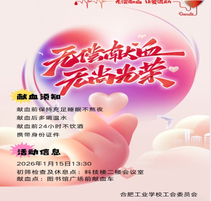 为深入贯彻《中华人民共和国献血法》精神,积极响应上级工会号召,1月15日,合肥工业学校以“无偿献血 无上光荣”为主题,精心组织教职工开展无偿献血活动。全校教职工以滚烫热血传递生命温度,用责任担当诠释公益初心,合肥实训中心的教师们亦专程赶来共赴爱心之约,校第八支部党员志愿者及学生志愿者全程护航,让这场冬日爱心行动暖意倍增、聚力成光。精心筹备:温情动员聚合力 志愿先行筑保障早在1月8日,校工会便精准部署,...