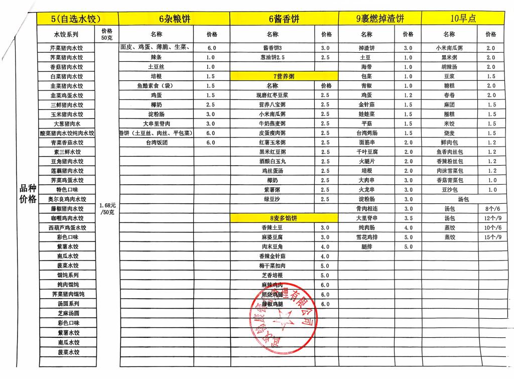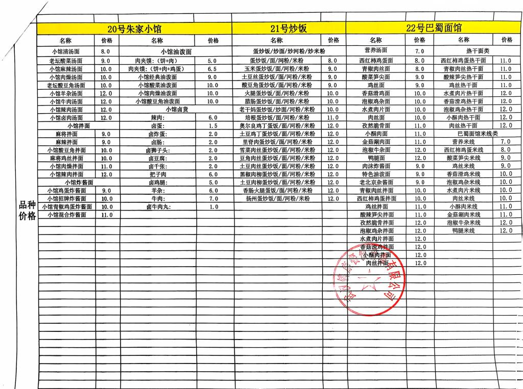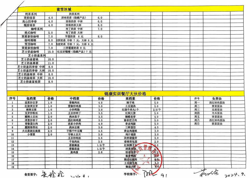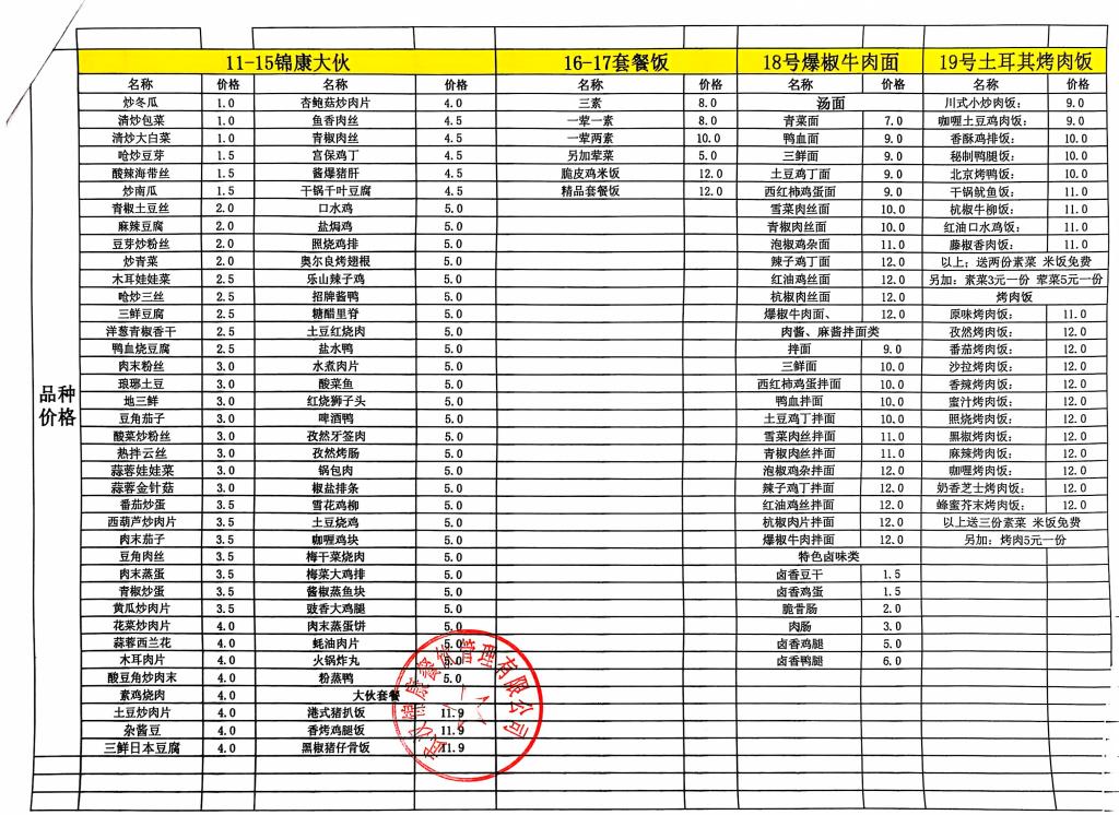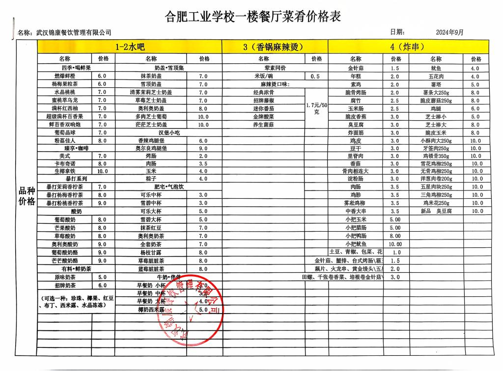 合肥工业学校第一食堂九月份食品价格公示