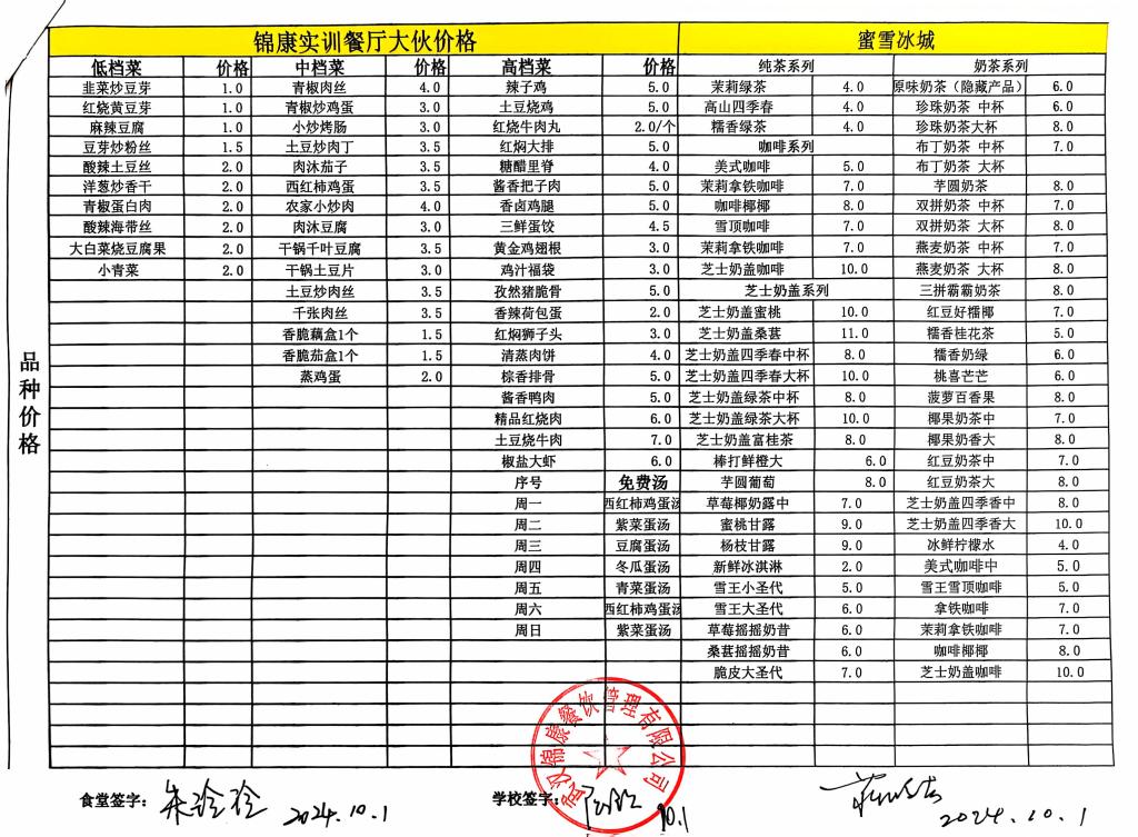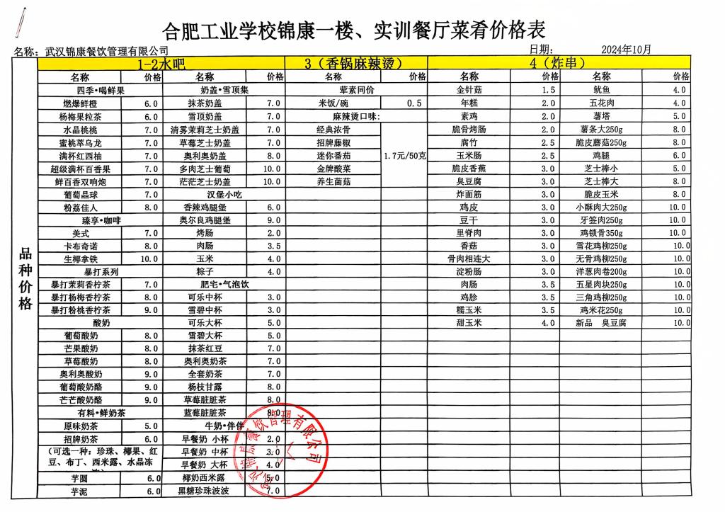 合肥工业学校第一食堂十月份食品价格公示