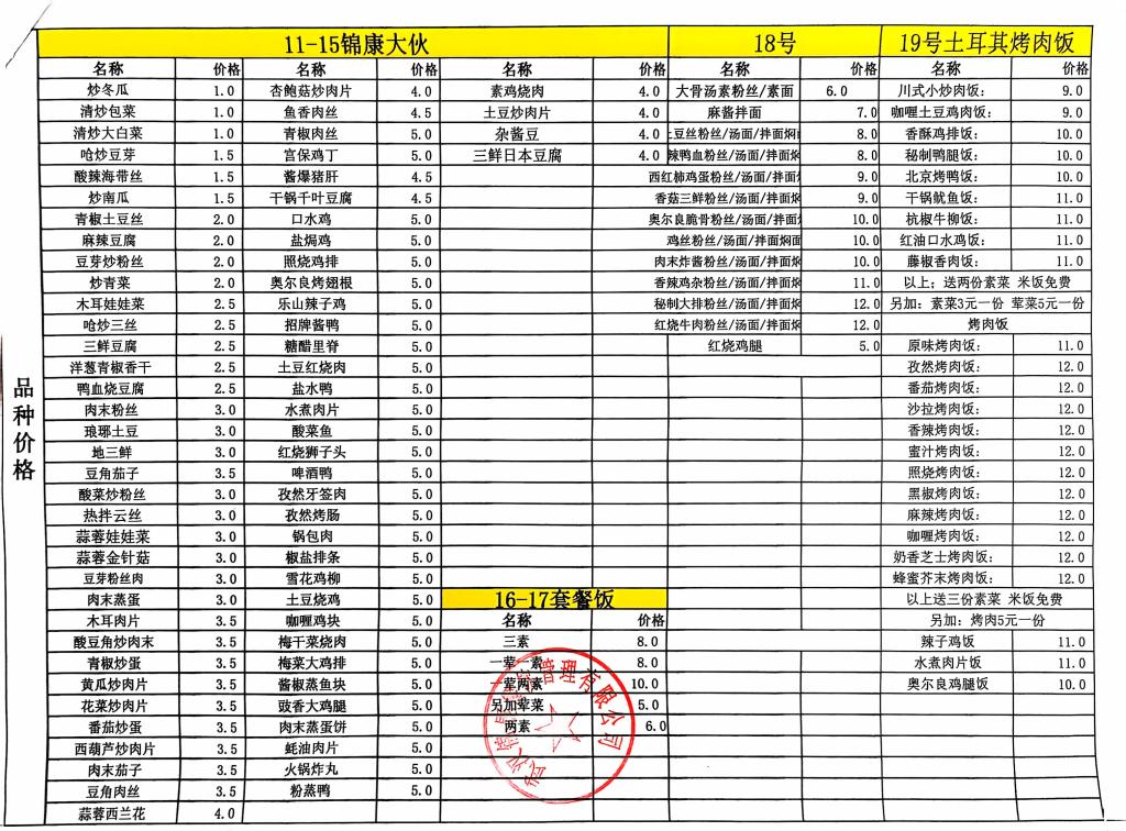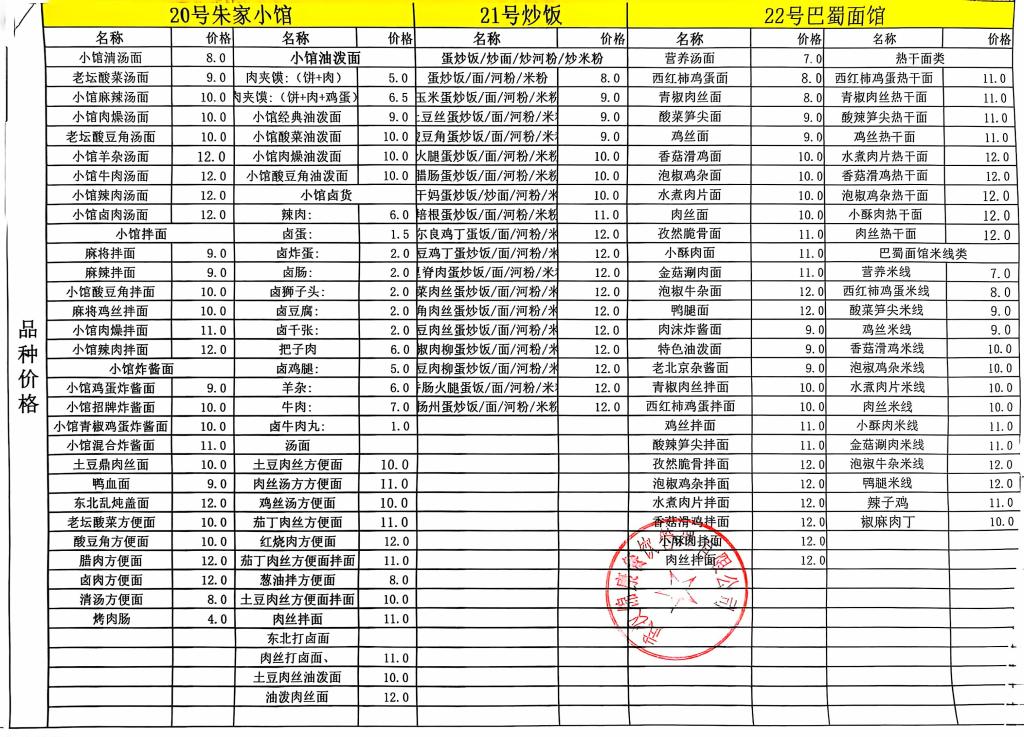 合肥工业学校第二食堂十月份食品价格公示