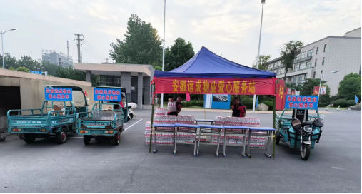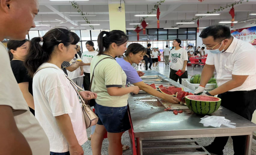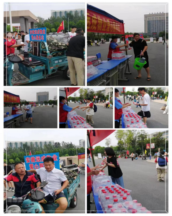 学校物业公司服务中心员工加班加点在校门口接待处撑起一排排帐篷,为师生及家长开启爱心服务模式,准备了大量的矿泉水,物业公司志愿者们以细心周到,热情的服务迎接报道的新生,食堂为家长及学生免费提供西瓜。